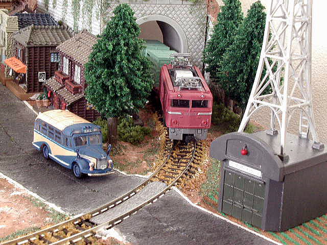 町はずれの踏切を通過する北たから号。右の火の見やぐらは、最近はまったく使われていませんが